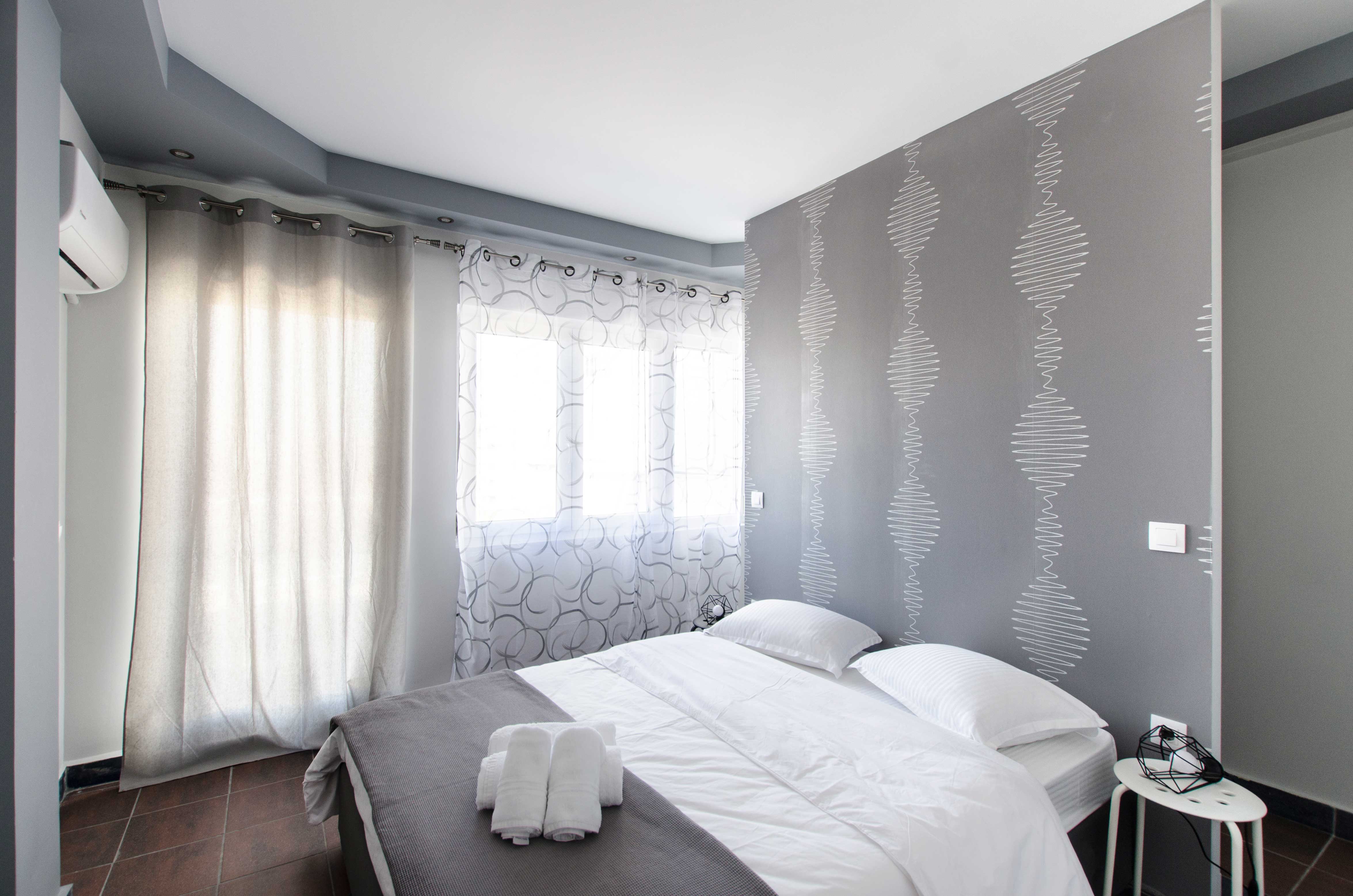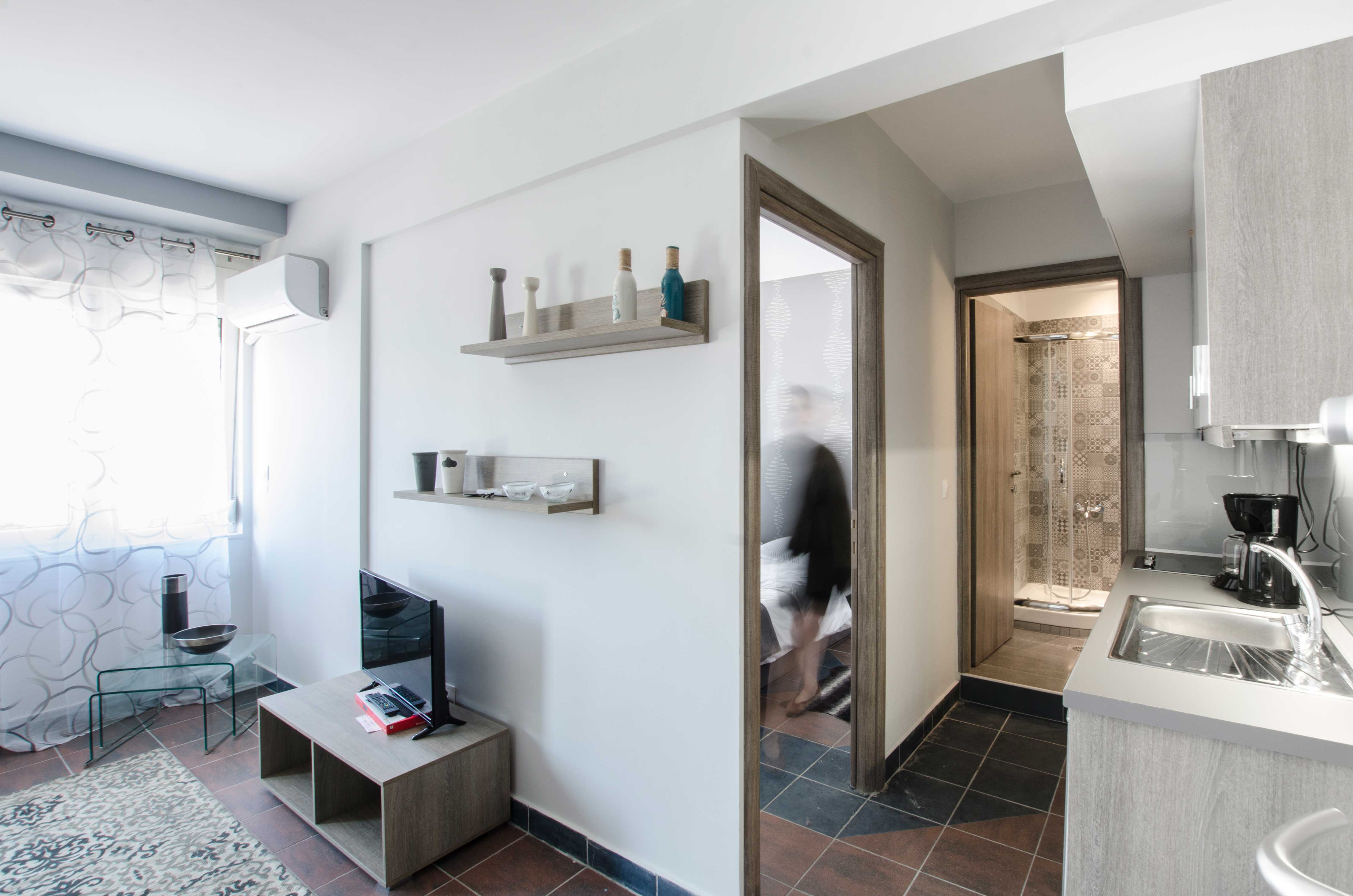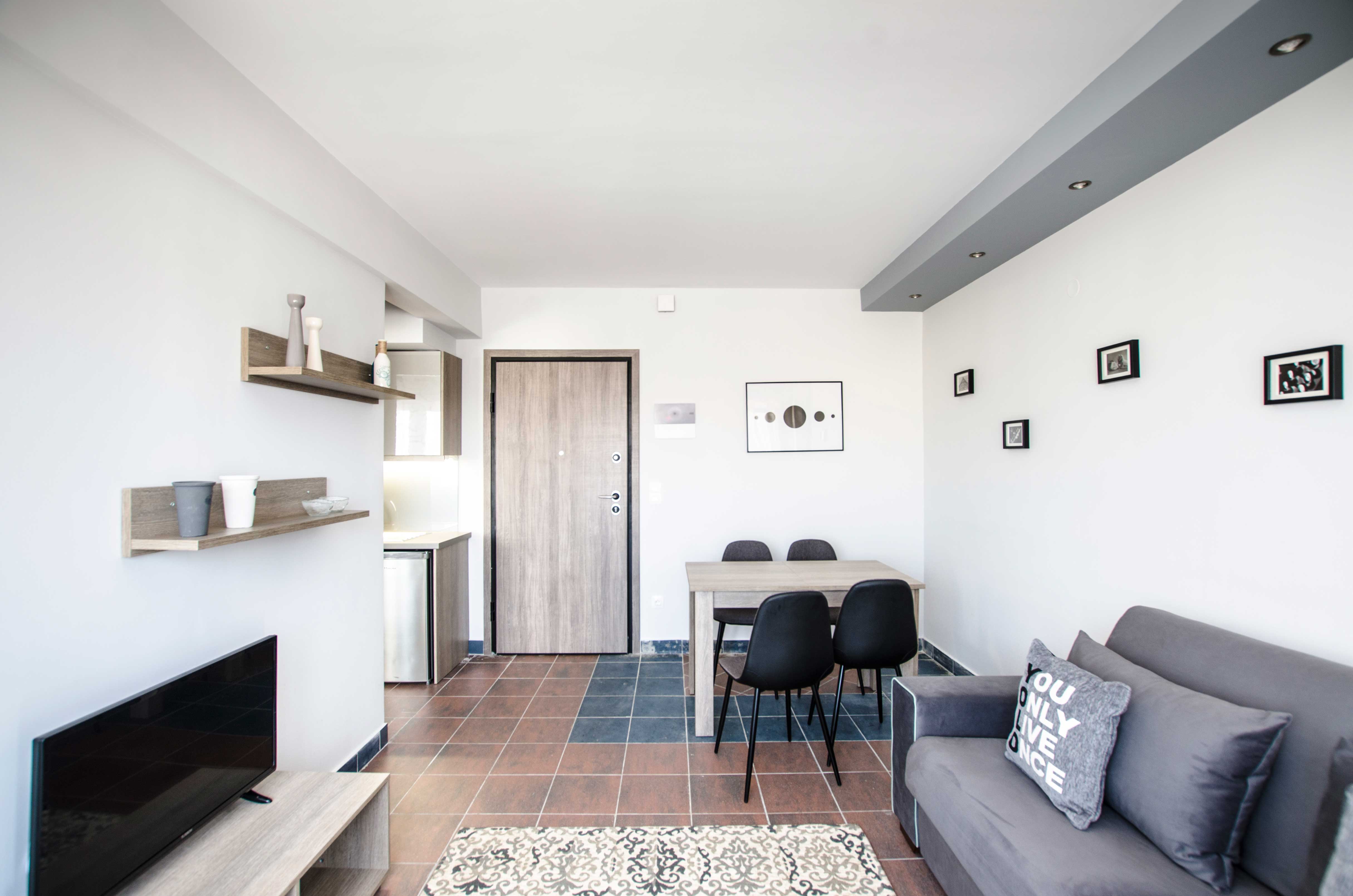With an area of approximately 45 square meters, this flat can accommodate up to 4 people. It offers a bedroom with a double bed (1.50m x 2.00m) and the living room sofa can also be converted to a double, 1.50m x 2.00m, bed. It has a fully equipped kitchen, where you can prepare light meals and which is fitted with a table that also functions as a desktop. The elegant combination of living, sleeping and cooking spaces creates a comfortable, homely ambiance. The bathroom has a shower and is accessible via a small step. An air condition unit takes care of the flat’s heating and cooling needs, while the floors of the flat are paved in tiles. The flat is equipped with a smart TV, hairdryer, iron and there are bathroom condiments for our guests to use and enjoy. Wi-Fi access is free of charge. There is a communal launderette at the mezzanine of the building. Finally, the flat offers a spacious balcony with chairs and a table, ideal for smokers, as they are not allowed to smoke in the interior spaces of the flat.