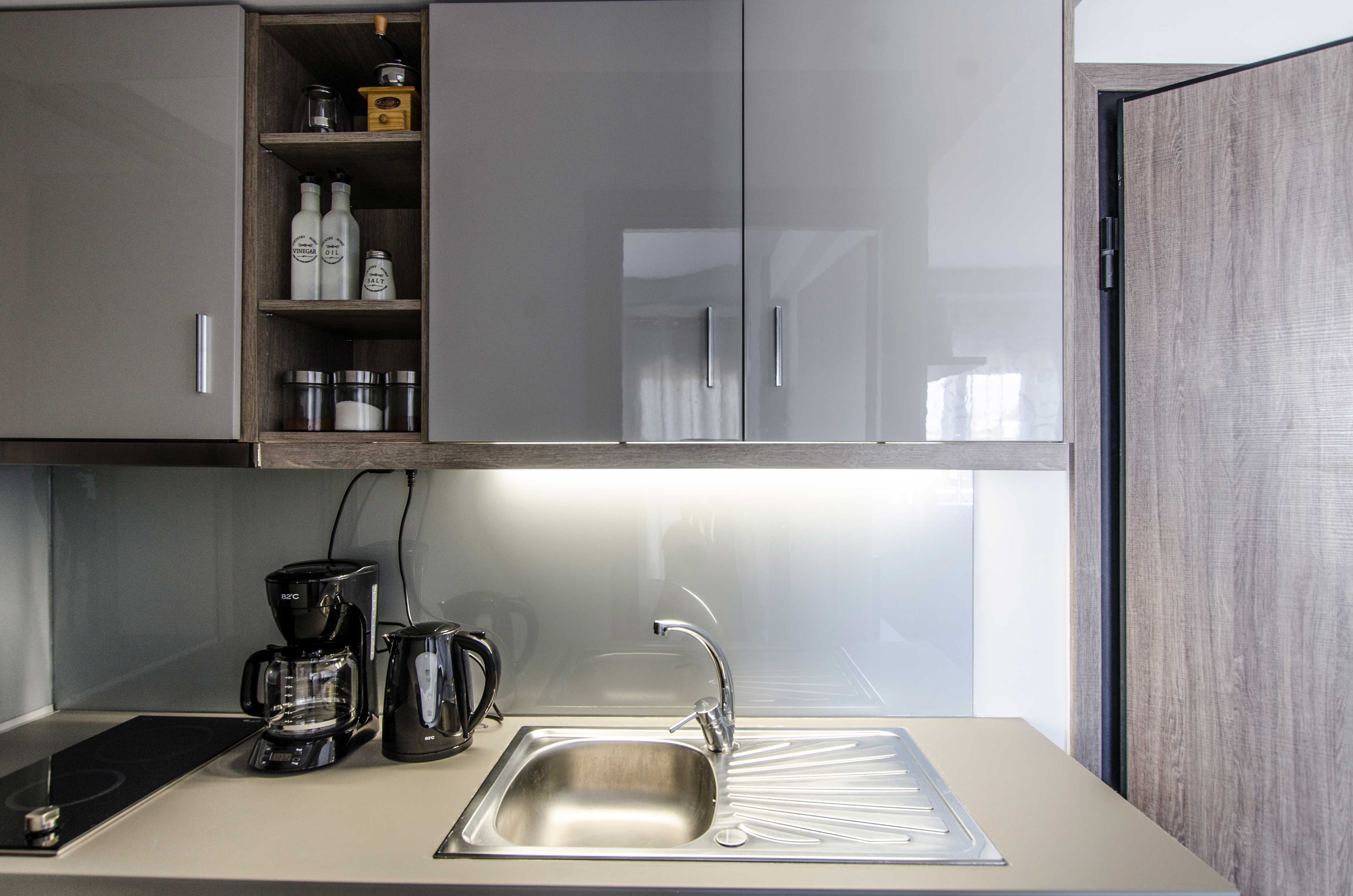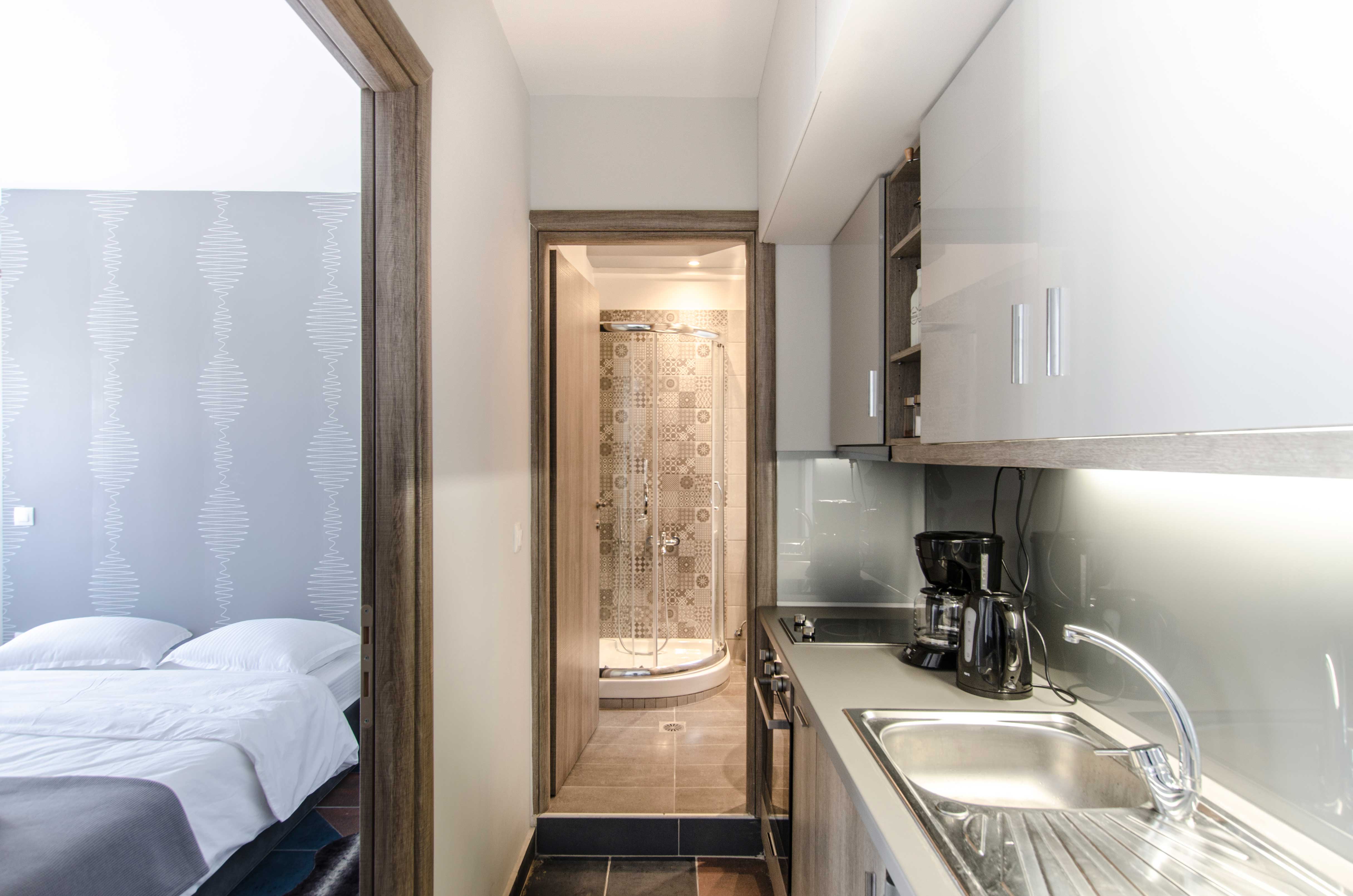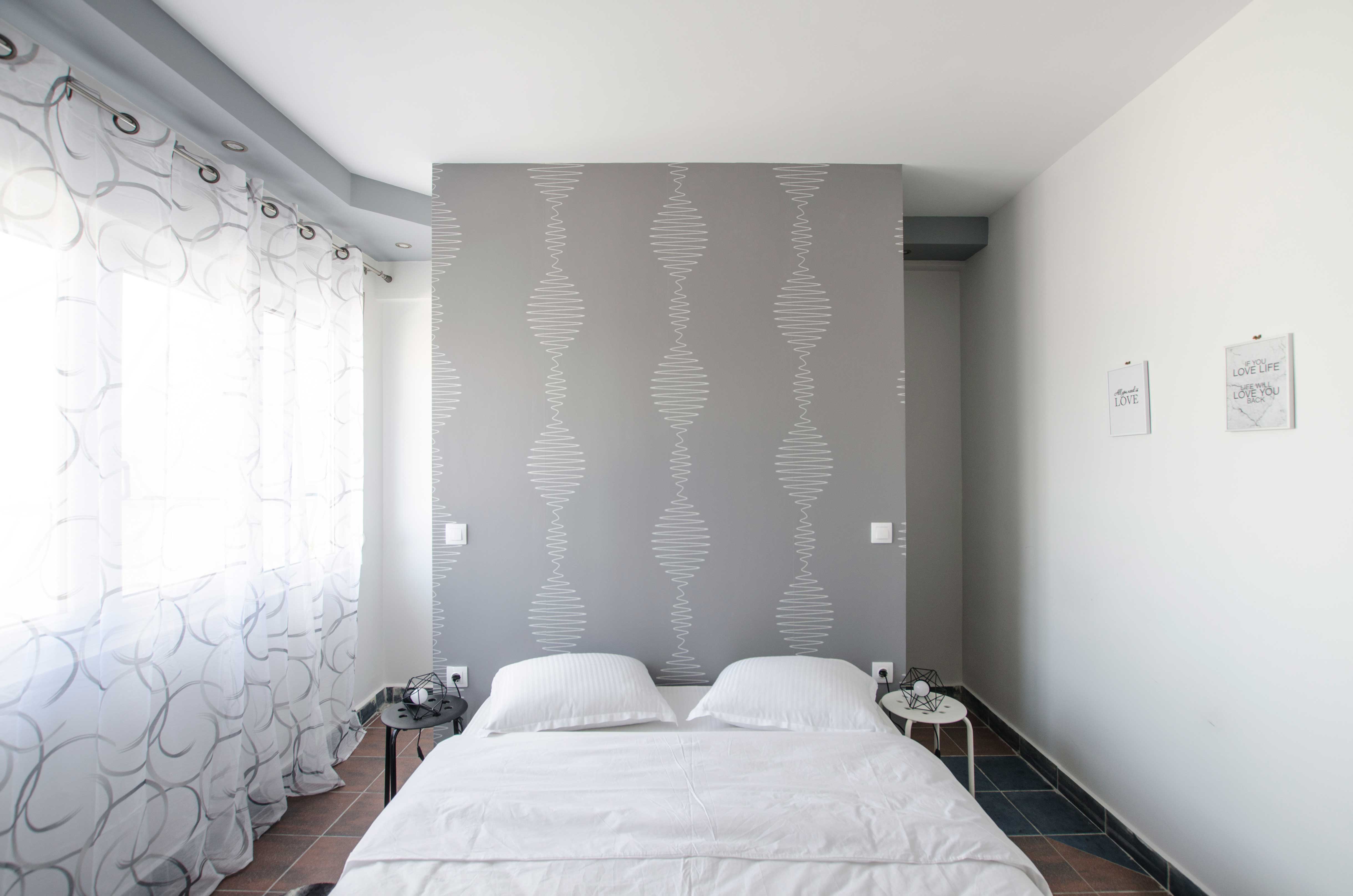 With an area of approximately 45 square meters, this flat can accommodate up to 4 people. It offers a bedroom with a double bed (1.50m x 2.00m) and the living room sofa can also be converted to a double, 1.50m x 2.00m, bed. It has a fully equipped kitchen, where you can prepare light meals and which is fitted with a table that also functions as a desktop. The elegant combination of living, sleeping and cooking spaces creates a comfortable, homely ambiance. The bathroom has a shower and is accessible via a small step. An air condition unit takes care of the flat’s heating and cooling needs, while the floors of the flat are paved in tiles. The flat is equipped with a smart TV, hairdryer, iron and there are bathroom condiments for our guests to use and enjoy. Wi-Fi access is free of charge. There is a communal launderette at the mezzanine of the building. Finally, the flat offers a spacious balcony with chairs and a table, ideal for smokers, as they are not allowed to smoke in the interior spaces of the flat.